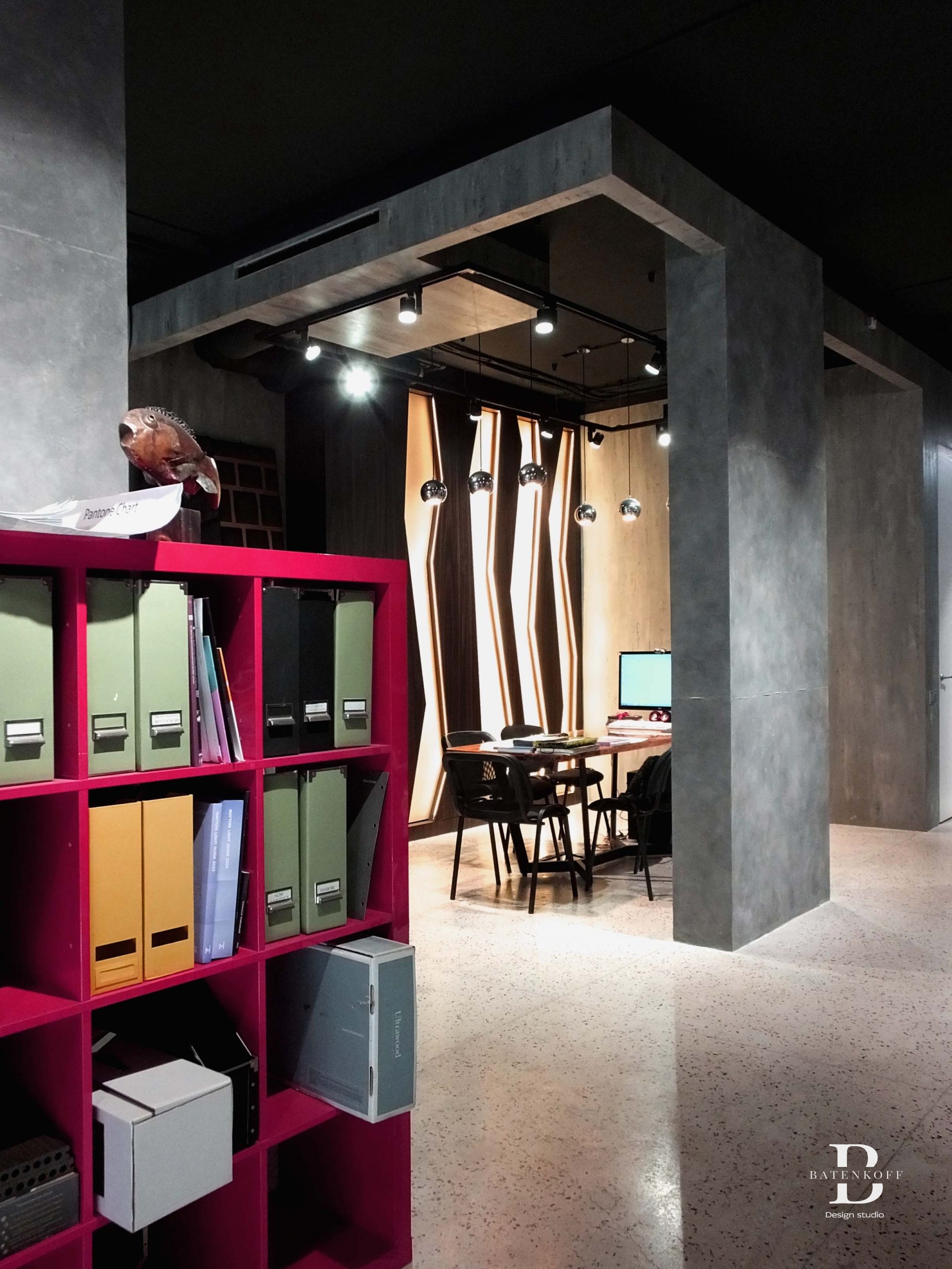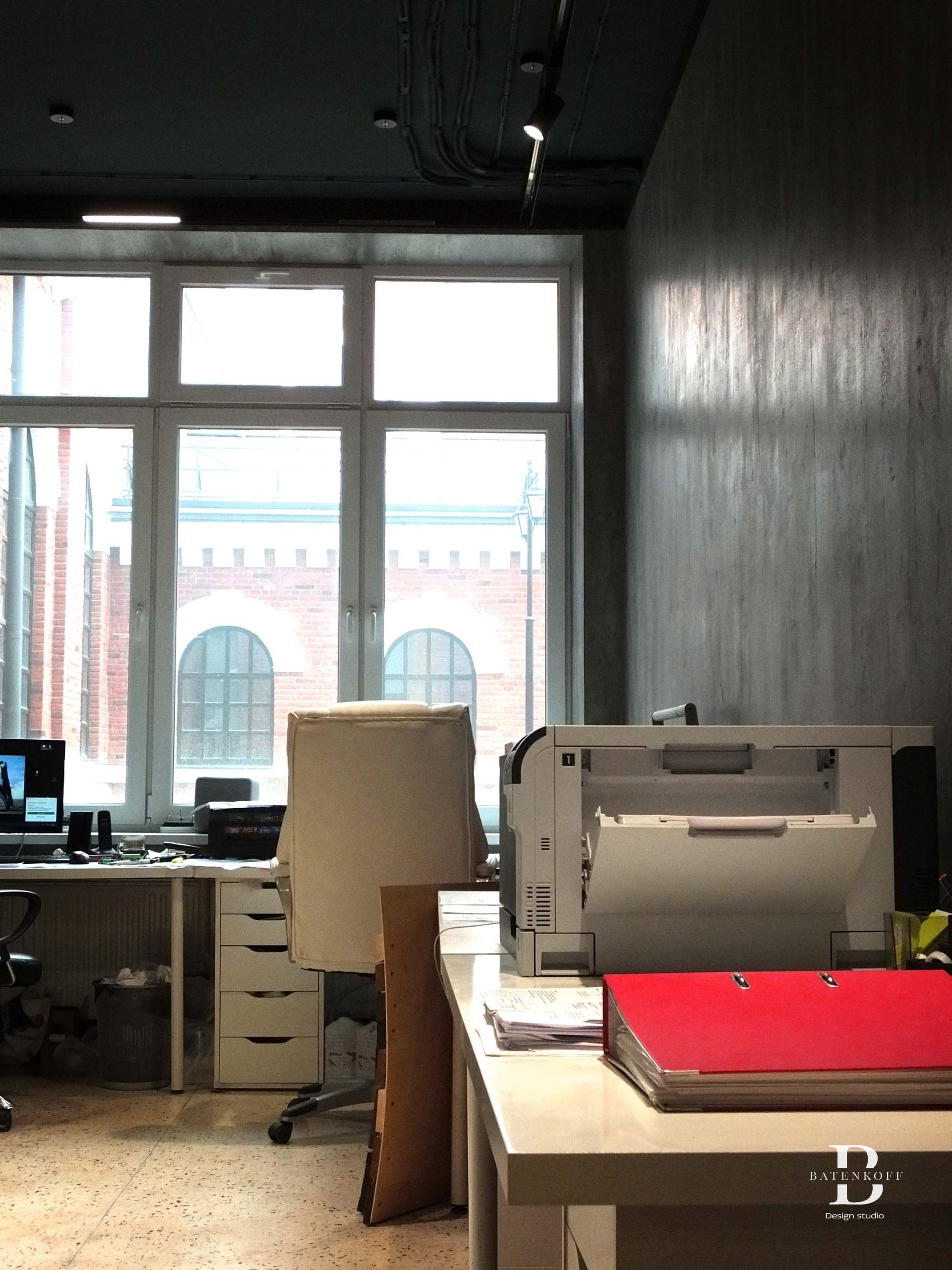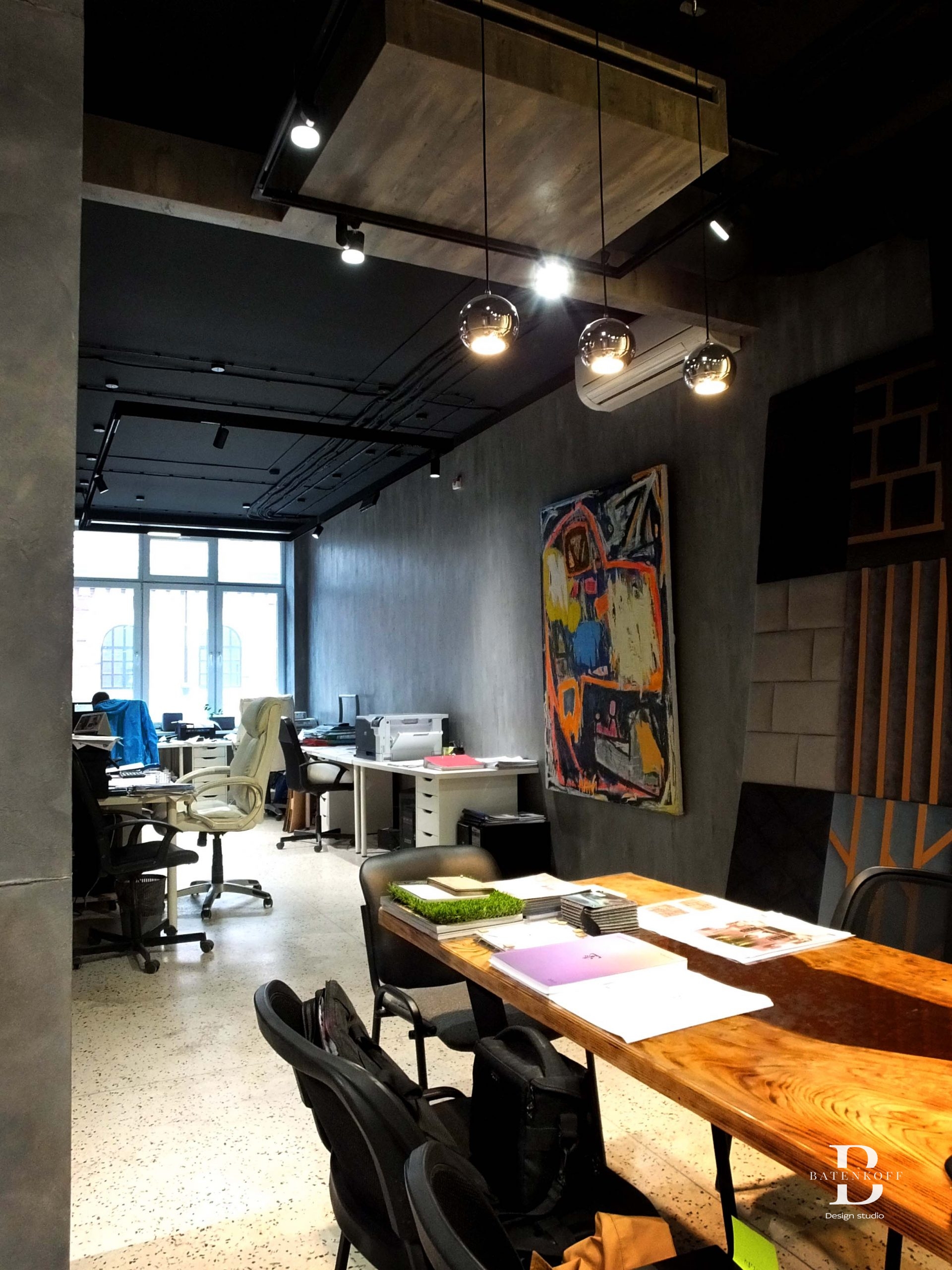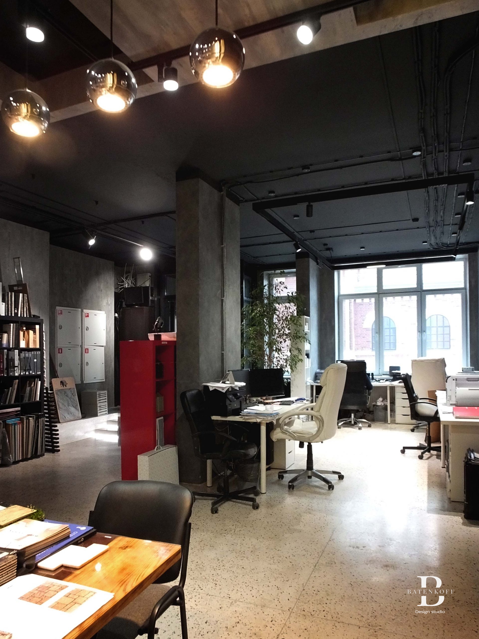 Новый офис Batenkoff Design Studio – это просторное помещение с высокими потолками, приятные рабочие места, освещенные дневным светом через панорамные окна, интерьер в стиле “лофт”, выполненный в современных отделочных материалах.